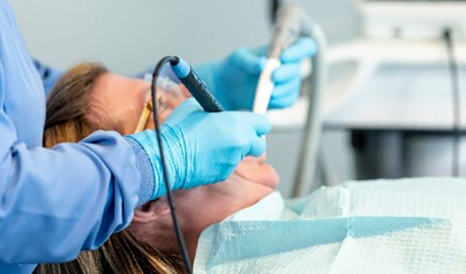 クリニックでは専用の器具を使用し歯周ポケット内の洗浄や、歯にこびりついてしまった歯石除去を専用機器(DentplySirona社製 Cavitron)で行います。歯石を取るための超音波スケーラーは刃の先端から超音波振動を発振させポケット内の歯垢や歯石を除去します。